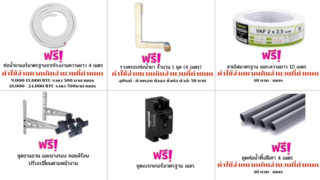 ท่อนำ้ยา 4 เมตร เกินจากนี้ 9,000-15,000 บีทียู ราคา 500 บาท/เมตร และ 18,000-24,000 บีทียู ราคา 700 บาท/เมตร